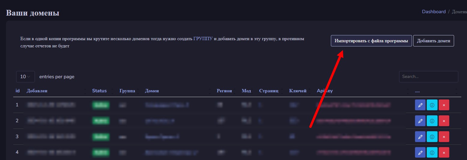 Далее необходимо добавить список страниц сайта, которые будут использоваться для продвижения. Для этого нам нужно перейти в дашборд домена, а сделать это можно двумя способами: