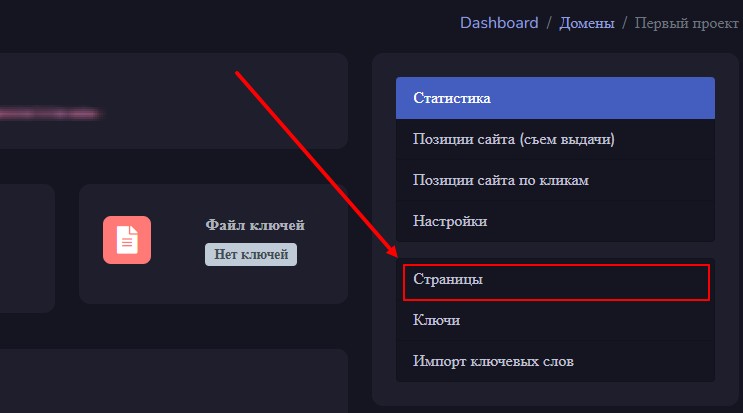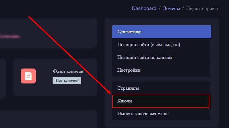 На данном этапе, нам необходимо добавить список ключевых фраз, используемых в проекте. Для этого переходим в раздел «Ключи». Его можно найти на странице проекта в правой части страницы:
