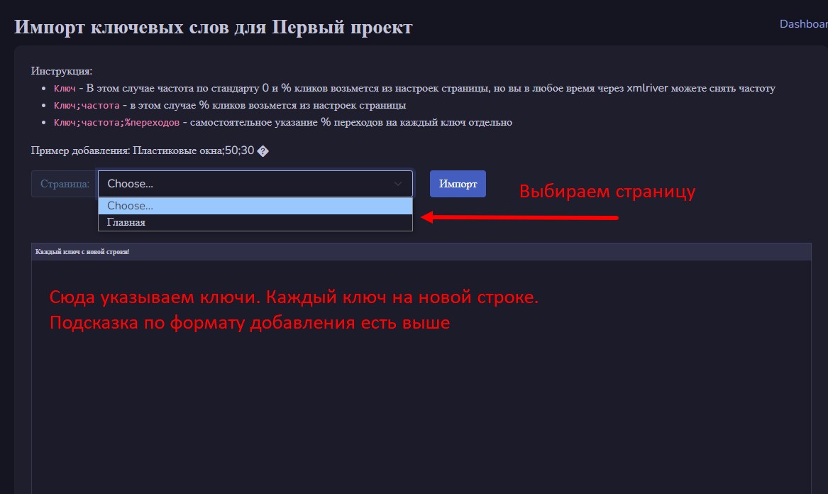 Далее появится поле для вставки Ваших фраз. Предварительно нужно выбрать из списка добавленных страниц ту, к которой будут присвоены добавляемые фразы. Если Вы не группируете фразы по страницам, просто выбирайте «Главную» и выгружайте список фраз в неё: