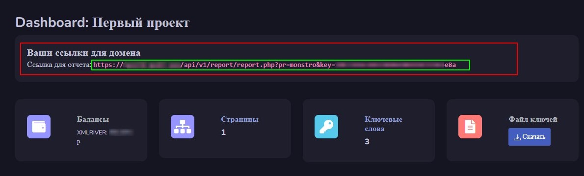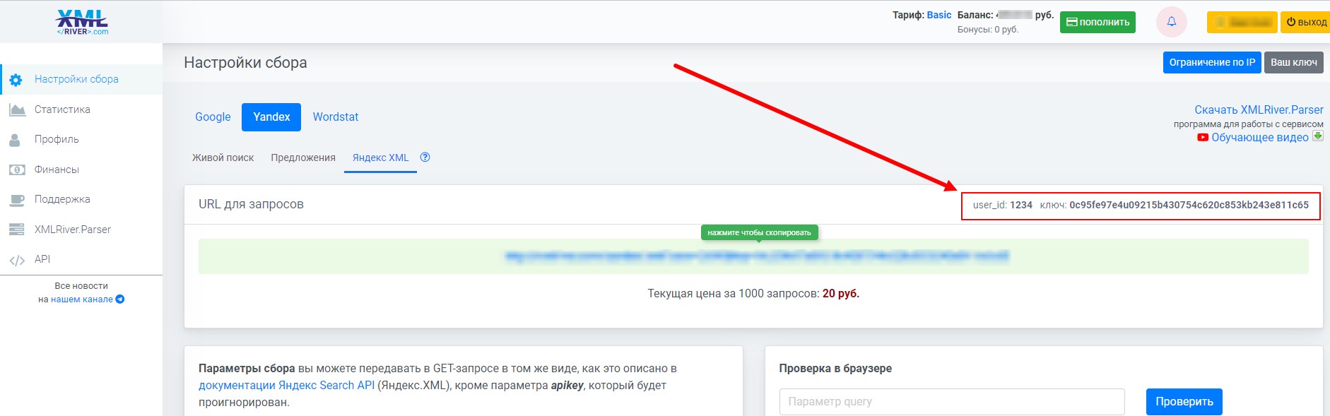 Регистрируемся в сервисе https://xmlriver.com/account/reg/ или авторизовываемся, после чего ищем свой USER_ID и Ключ. Они нам потребуются далее для настройки нашего профиля в панели. Не забываем заранее пополнить баланс на любую сумму, для начала хватит даже 50 рублей.