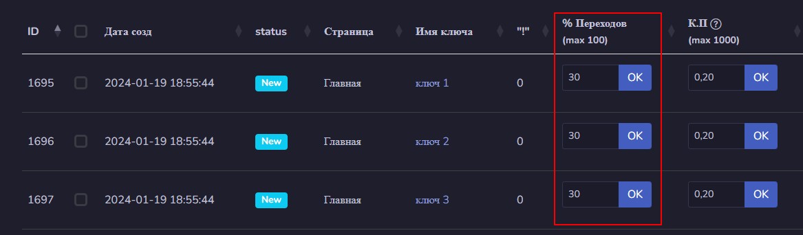 После съема частоты ключевых фраз, появляется возможность используя, частоту ключей, задать количество заходов ботов. Сделать это можно как для каждой фразы в отдельности, используя столбец % Переходов: