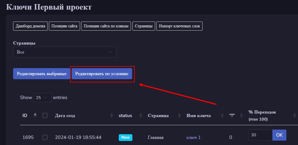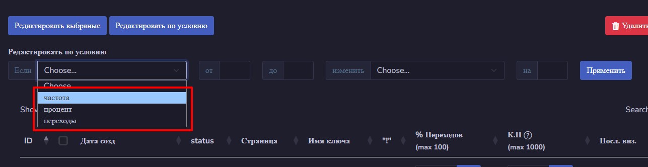Также есть возможность массово вносить изменения в частоту переходов по условию. Как это работает? Допустим, у вас есть фразы с нулевой или около нулевой частотностью. Таким фразам часто задается заход, равный 1.100 - это минимальное число заходов для ключа. Но этого часто крайне мало и переходы по фразам делать нужно, тогда мы идем и задаем условие, кликнув по кнопке «Редактировать по условию»:
