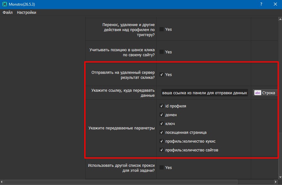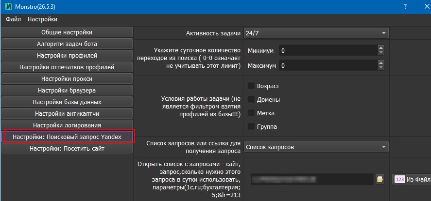 В Monstro, в зависимости от текущей версии софта, ссылка может слегка менять свое положение, но суть останется та же. Идем в настройки задачи «Поисковый запрос Яндекс» (предполагается, что задача уже выставлена и вы имеете представление как крутить ПФ).